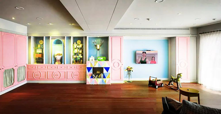 甜美的粉色櫥柜與相鄰的明亮藍(lán)色電視背景墻形成了美妙的色彩沖突,這是一個年輕的色調(diào)搭配,也是一種情感色彩的組合,感覺就像一個快樂的擁抱,木地板被用于整個室內(nèi),建立額外的紋理感。