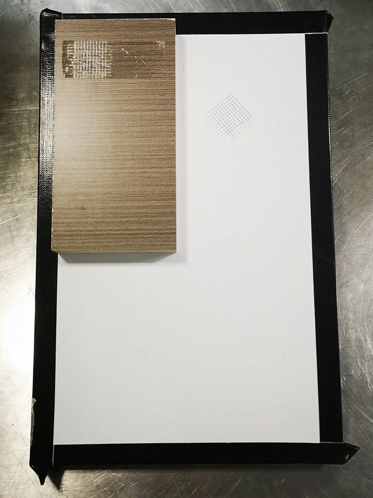▲在三聚氰胺板材上直接涂水性白面漆的密著性測試