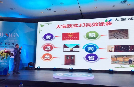 涂料作為木器產(chǎn)業(yè)鏈的下游產(chǎn)業(yè),與家具行業(yè)有著天然的聯(lián)系。作為青木大講堂戰(zhàn)略合作伙伴、木制品涂裝工藝顧問,大寶漆不負(fù)所望,為大會帶去了“大寶漆定制家具涂裝解決方案”即大寶歐式涂裝三三專案。黃文敏高專從大寶漆的特點與優(yōu)勢入手,突出了歐式涂裝所具備的“薄、透、美、穩(wěn)、簡、省”等特點。