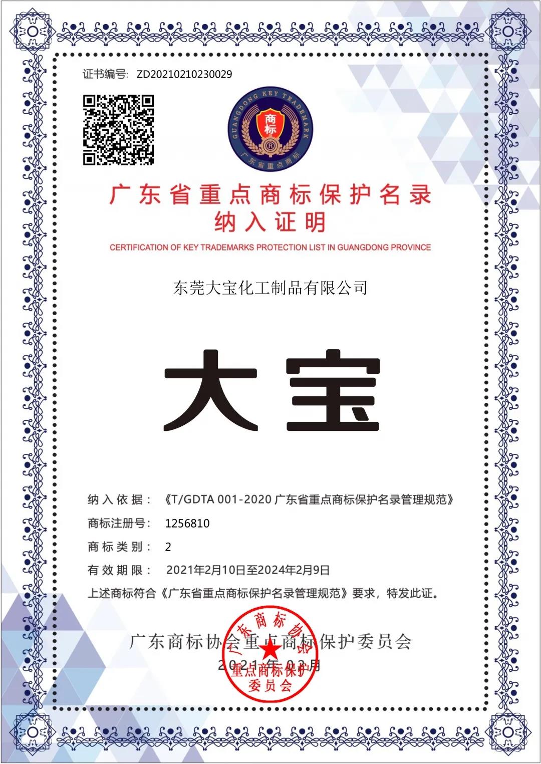 經過近一年的嚴格審查和篩選,近日,大寶漆商標被納入廣東省重點商標保護名錄。據悉本次評選涵蓋全國各大知名品牌企業,最終有790多件商標納入本次保護名錄中!新征程喜訊加磅,企業實力及品牌價值再獲權威認證!