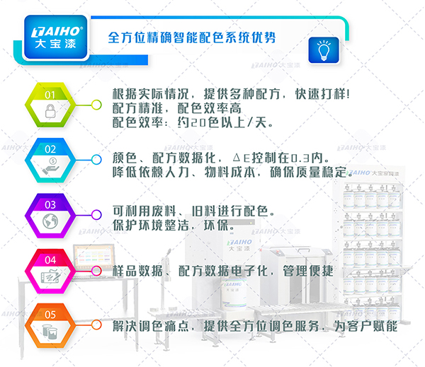 大寶家具漆為了解決在不同環境下、不同操作人員都能得到精準的配色效果,同時提高配色時效性,專為合作伙伴引入全方位精確智能配色系統服務。