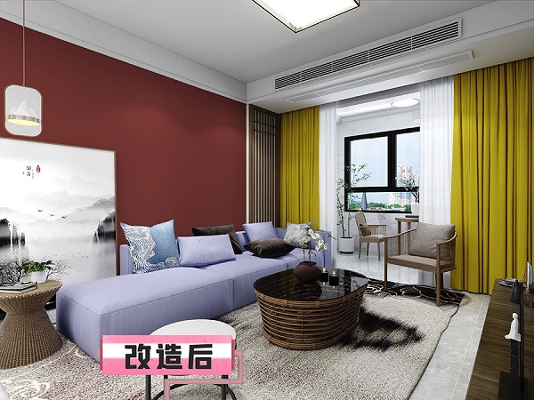 客廳墻面面積較大,更換墻面顏色對整體空間氛圍營造有明顯效果,但大紅色的彩度太高,不宜長期直視,可以刷上大寶色號R8149-32A 紅棗,換上相近色的窗簾,低彩調讓客廳更沉穩優雅。